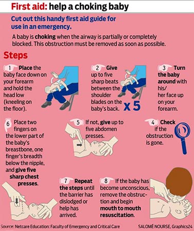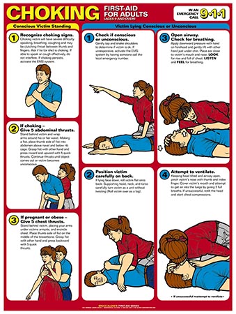หากเกิดอาหารติดคอ หายใจไม่ได้ พูดไม่ออก ให้รีบปฐมพยาบาลเบื้องต้น โดยจับผู้ป่วยนอนหงายบนพื้น และเปิดทางเดินหายใจ ยกปลายคางขึ้น และ อีกมือหนึ่งกดหน้าผากลง เป่าปากเพื่อช่วยในการหายใจ ถ้าลองเป่าปากแล้วหน้าอกไม่ยกขึ้น ให้ใช้มือกดที่ท้อง ในท่านอนหงาย 6 – 10 ครั้ง แต่ถ้าเป็นเด็กเล็กให้ใช้วิธีตบระหว่างสะบักทั้ง 2 ข้าง สลับกับกดหน้าอก และคอยตรวจเช็คช่องปาก ถ้ามองเห็นสิ่งแปลกปลอมให้ใช้นิ้วเกี่ยวออกมา และหากผู้ป่วยยังคงรู้สึกตัว พูดได้และหายใจได้ตามปกติ ให้รีบพาไปพบแพทย์ทันที
