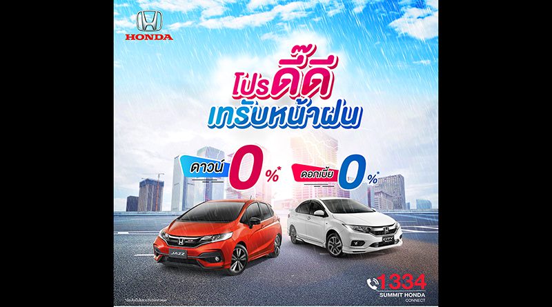 ซัมมิท ฮอนด้า ออโตโมบิล ภายใต้กลุ่มบริษัท มาสเตอร์ กรุ๊ป คอร์ปอเรชั่น (เอเชีย) จำกัด หรือ เอ็มจีซี-เอเชีย หนึ่งในผู้จำหน่ายรถยนต์ ฮอนด้า อย่างเป็นทางการในประเทศไทย จัดโปรโมชั่นทีเด็ดส่งท้ายไตรมาส 3 กับแคมเปญ ‘โปร ดี๊ ดี เทรับหน้าฝน’ มอบสิทธิพิเศษมากมายให้ลูกค้า ที่โชว์รูม ซัมมิท ฮอนด้า ทุกสาขา ตลอดเดือนกันยายน