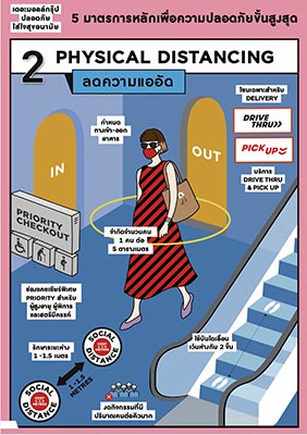 2.ลดความแออัด ด้วยการ จำกัดจำนวนคน ในพื้นที่ 1 คน ต่อ 5 ตารางเมตร, กำหนดทางเข้าและออก เพื่อจุดคัดกรอง และลดการเดินสวนกันที่บริเวณประตู, กำหนดระยะห่างในพื้นที่ส่วนกลาง ทั้งภายในลิฟท์ การยืนบนบันไดเลื่อน รวมถึงการยืนรับบริการในจุดต่างๆ, จำช่องบริการพิเศษสำหรับ คนชรา สตรีมีครรภ์ ผู้พิการ, จัดโซนสำหรับ พนักงาน Delivery โดยเฉพาะ ให้มีระยะห่าง ทั้งการ รับ/รอ สินค้า, งดกิจกรรมทางการตลาด ที่มีปริมาณคนต่อคิวมาก งดกิจกรรมในแผนกเด็กทั้งหมด เช่น โต๊ะบริการของเล่น, อุปกรณ์เสริมทักษะทุกประเภท กำหนดระยะห่างของเครื่องเล่นหยอดเหรียญไม่น้อยกว่า 1.5 เมตร และจัดให้มีบริการ Drive Thru & Pick Up ในห้างสรรพสินค้า