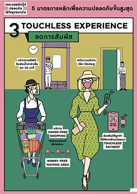 3.สร้างสังคมไร้สัมผัส โดย จัดพนักงานบริการกดลิฟต์, จัดพนักงานบริการเปิด – ปิดประตูศูนย์การค้า,