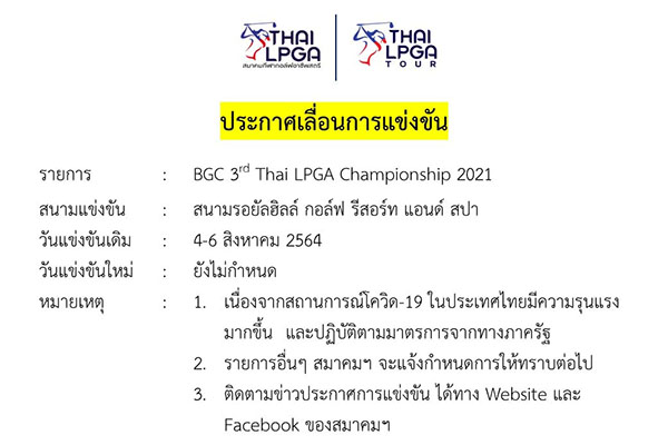 ด้วยสถานการณ์การแพร่ระบาดอย่างหนักของ ไวรัส โควิด-19 ระลอกใหม่ที่ยังคงมีจำนวนตัวเลขผู้ติดเชื้อเพิ่มขึ้นอย่างต่อเนื่อง ล่าสุดสมาคมกีฬากอล์ฟอาชีพสตรี ผู้จัดการแข่งขันกอล์ฟอาชีพ ไทย แอลพีจีเอ ทัวร์ 2021 ขานรับมาตรการภาครัฐด้วยการประกาศเลื่อนการแข่งขันกอล์ฟ ไทยแอลพีจีเอ สนามที่ 3 ในรายการ บีจีซี ไทย แอลพีจีเอ แชมเปี้ยนชิพ 2021 ที่สนาม รอยัลฮิลล์ กอล์ฟ รีสอร์ท แอนด์ สปา จ.นครนายก ระหว่างวันที่ 4-6 ส.ค.นี้ ออกไปแบบไม่มีกำหนด