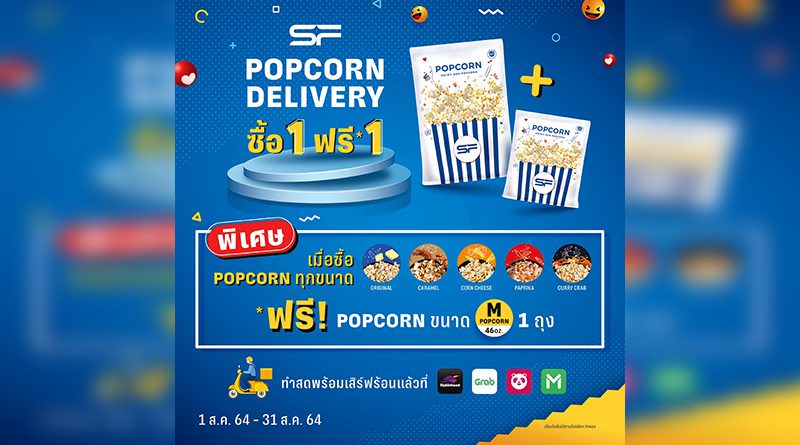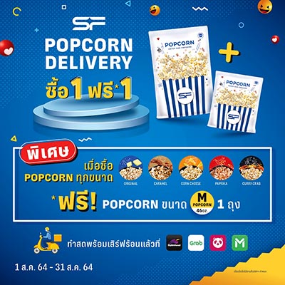 คนรักป๊อปคอร์นต้องไม่พลาด โรงภาพยนตร์ในเครือ เอส เอฟ ส่งโปรโมชันสุดคุ้มตลอดเดือนสิงหาคม ให้เติมเต็มความสุขระหว่างอยู่บ้านด้วยป๊อปคอร์นสุดอร่อย พร้อมส่งถึงบ้านทุกรสชาติ ได้แก่ ออริจินัล, คาราเมล, คอร์นชีส, ปาปริก้า รวมถึงรสชาติพิเศษกับ รสปูผัดผงกะหรี่ เพียงซื้อ Popcorn Delivery ขนาด L ในราคา 150 บาท หรือขนาด XL ในราคา 170 บาท รับฟรีทันที Popcorn Delivery ขนาด M อีก 1 ถุง เมื่อสั่งผ่านช่องทางแอปพลิเคชัน Robinhood, GRAB, foodpanda หรือ LINE MAN ตั้งแต่วันนี้เป็นต้นไปจนถึง 31 สิงหาคม 2564