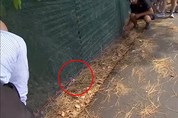 สภาพลูกที่หยุดอยู่ ดูค่อนข้างยาก KEN TACKETT ผู้ตัดสิน PGA Tour ต้องเดินกลับไปที่รถกอล์ฟเพื่อนำสายเทปวัดระยะจากกระเป๋าเป้ ไปวัดว่าลูกว่าโอบีหรือไม่ วิธีการวัด ให้ผู้ช่วยดึงสายเทปที่มุมเสาด้านล่างใน ดึงสายเทปให้ตึงไปจรดที่ปลายมุมอีกเสาหนึ่ง แนวสายเทปนี้จะเป็นแนวโอบี ปรากฏว่าลูกของ Bryson DeChambeau ทุกส่วนยังไปออกพ้นขอบเขตสนาม จึงไม่โอบี