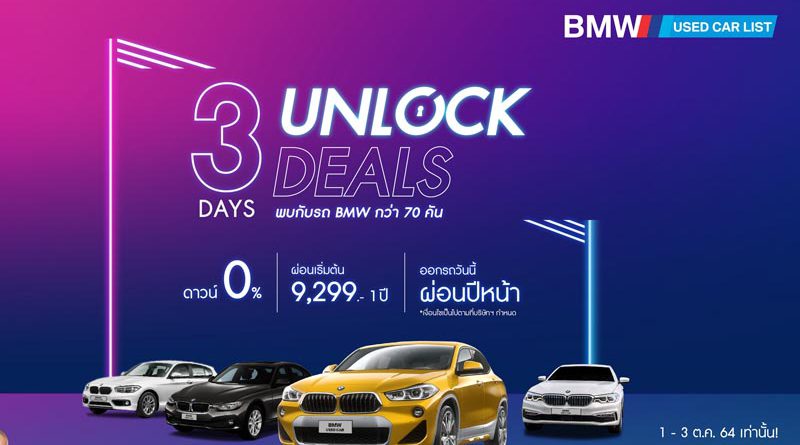 มาสเตอร์ฯ จัดกิจกรรม ‘3 DAYS UNLOCK DEALS’ ปลดล็อคการออกรถแบบเดิมๆ กับ BMW Used Car กว่า 70 คัน ไม่ต้องดาวน์ ผ่อนสบาย 12 เดือนแรก เริ่มต้นเพียง 9,299 บาท 1-3 ตุลาคมนี้ เพราะโอกาสดีๆ มีแค่ 3 วัน