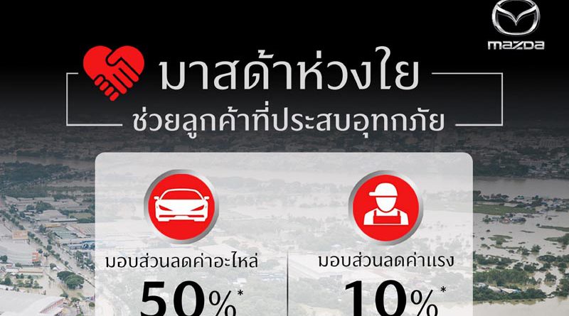 มาสด้าห่วงใยลูกค้าที่รถยนต์ได้รับความเสียหายจากเหตุการณ์น้ำท่วม จัดแคมเปญด่วนพิเศษเพื่อมอบส่วนลดค่าอะไหล่ 50%* และส่วนลดค่าแรง 10% ที่ศูนย์บริการรถยนต์มาสด้า ตั้งแต่วันนี้ไปจนถึงวันที่ 31 ตุลาคม 2564 เพื่อให้การช่วยเหลือและแบ่งเบาภาระค่าใช้จ่ายของลูกค้าที่ได้รับความเดือดร้อนจากอุทกภัยให้สามารถก้าวผ่านเหตุการณ์ครั้งนี้ไปได้อีกครั้ง