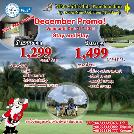 สนามไมด้า กอล์ฟคลับ กาญจนบุรี จัดโปรโมชั่น Stay&play ออกรอบพร้อมที่พักกับราคาโดนใจ วันธรรมดาเพียงท่านละ 1,299 บาท ราคานี้รวม(ที่พัก -พร้อมอาหารเช้า-ไม่ จำกัด กรีนฟี + รถกอล์ฟ +แคดดี้ 18 หลุม) วันหยุดเพียงท่านละ 1,499 บาท ราคานี้รวม(ที่พัก – พร้อมอาหารเช้า – กรีนฟี 18 หลุม – รถกอล์ฟ 18 หลุม – แคดดี้ 18 หลุม)เงื่อนไขเพิ่มเติม พัก 2 ท่าน/1 ห้อง เล่นกอล์ฟภายใน 1 วัน กรณีพักเดี่ยวเพิ่ม 300 บาท มีผู้ติดตามเพิ่ม 500 บาท
