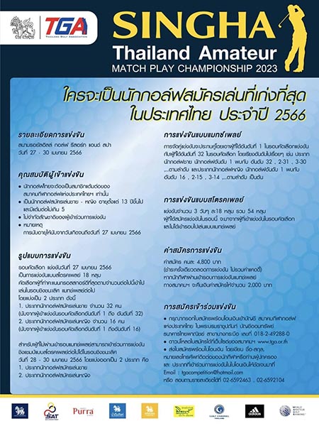 สมาคมกีฬากอล์ฟแห่งประเทศไทยฯ เรียนเชิญนักกอล์ฟ ร่วมสมัครเข้าร่วมการแข่งขัน กอล์ฟสมัครเล่นระบบแมตซ์เพลย์ชิงแชมป์ประเทศไทย “สิงห์ ไทยแลนด์ อเมเจอร์ แมตซ์เพลย์ แชมเปี้ยนชิพ 2023”