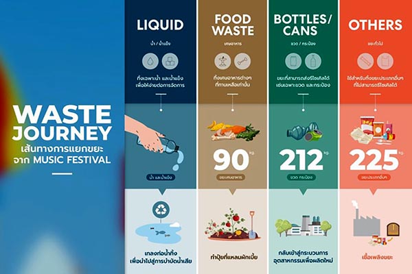 Others: สำหรับทิ้งขยะประเภทอื่นๆ ที่ไม่สามารถรีไซเคิลได้ ได้แก่ ภาชนะใส่อาหาร ช้อน ส้อม ตะเกียบ แก้วน้ำ ซองขนม ไม้เสียบลูกชิ้น หลอด ถุงพลาสติก และหนังยาง เป็นต้น เมื่อคัดแยกแล้ว มีจำนวนกว่า 225 กิโลกรัม เราได้จัดส่งให้โรงงานเพื่อแปรรูปเป็นเชื้อเพลิงทดแทน โดยกระบวนการแปรรูปนี้มีการควบคุมมลพิษอย่างถูกต้อง