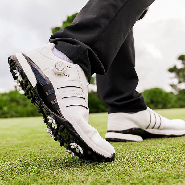 ประสิทธิภาพ (PERFORMANCE) : นับเป็นหัวใจสำคัญที่สุดที่ทีมงานอาดิดาสคำนึงถึง โดยวัสดุและเทคโนโลยีระดับสูงได้แก่ TORSION BRIDGE ชิ้นส่วน TPU ที่มีความอ่อนและแข็งต่างกัน ทำหน้าที่เชื่อมส่วนพื้นชั้นกลางให้แข็งแรง ควบคุมแรงบิดขณะสวิงได้อย่างมั่นคง ทั้งยังสอดรับพื้นชั้นนอกส่วนกลางเท้า (Mid foot) เพิ่มความยืดหยุ่นให้นักกอล์ฟทรงตัวได้อย่างดีแม้พื้นที่ต่างระดับกัน สร้างความนุ่มนวลรับรองการเดินและสวิงได้อย่างรุนแรง ด้วยพื้นชั้นกลาง JET BOOST ในส่วนส้นเท้า ผสานเข้ากับ LIGHTSTRIKE ในส่วนกลางเท้าไปถึงปลายเท้า ส่วนพื้นรองเท้าชั้นนอกออกแบบมาเพื่อการยึดเกาะสูงสุดด้วย THINTECH 7-spike ผลิตจาก TPU ชนิดแวววาวลดการอุดตันของเศษดินและเศษหญ้า ดีไซน์ปุ่มแบบถอดได้ 7 ตำแหน่ง ผสานเข้ากับ Lug และ Dynamic Flex Groove เพื่อประสิทธิภาพที่นักกอล์ฟต้องการมากที่สุด