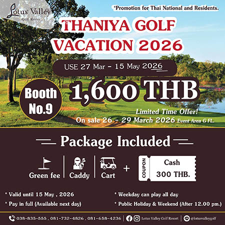 สนามโลตัส วัลเล่ย์ กอล์ฟ รีสอร์ต จ.ฉะเชิงเทรา เข้าร่วมงาน ‘Thaniya Golf & Vacation’ ณ ศูนย์การค้าธนิยะพลาซ่า พร้อมเสนอโปรโมชั่นพิเศษ ราคา 1,600 บาท/18หลุม รวม กรีนฟี, แคดดี้, รถกอล์ฟ และคูปองแทนเงินสด 300 บาท เฉพาะในงานนี้เท่านั้น นักกอล์ฟสามารถเข้าร่วมชมงาน สอบถามรายละเอียดเพิ่มเติม และจับจองโปรโมชั่นพิเศษได้ที่งาน ‘Thaniya Golf & Vacation’ บูธที่ 9 ชั้น G ศูนย์การค้าธนิยะพลาซ่า ระหว่างวันที่ 26-29 มีนาคม 2569 นี้เท่านั้น